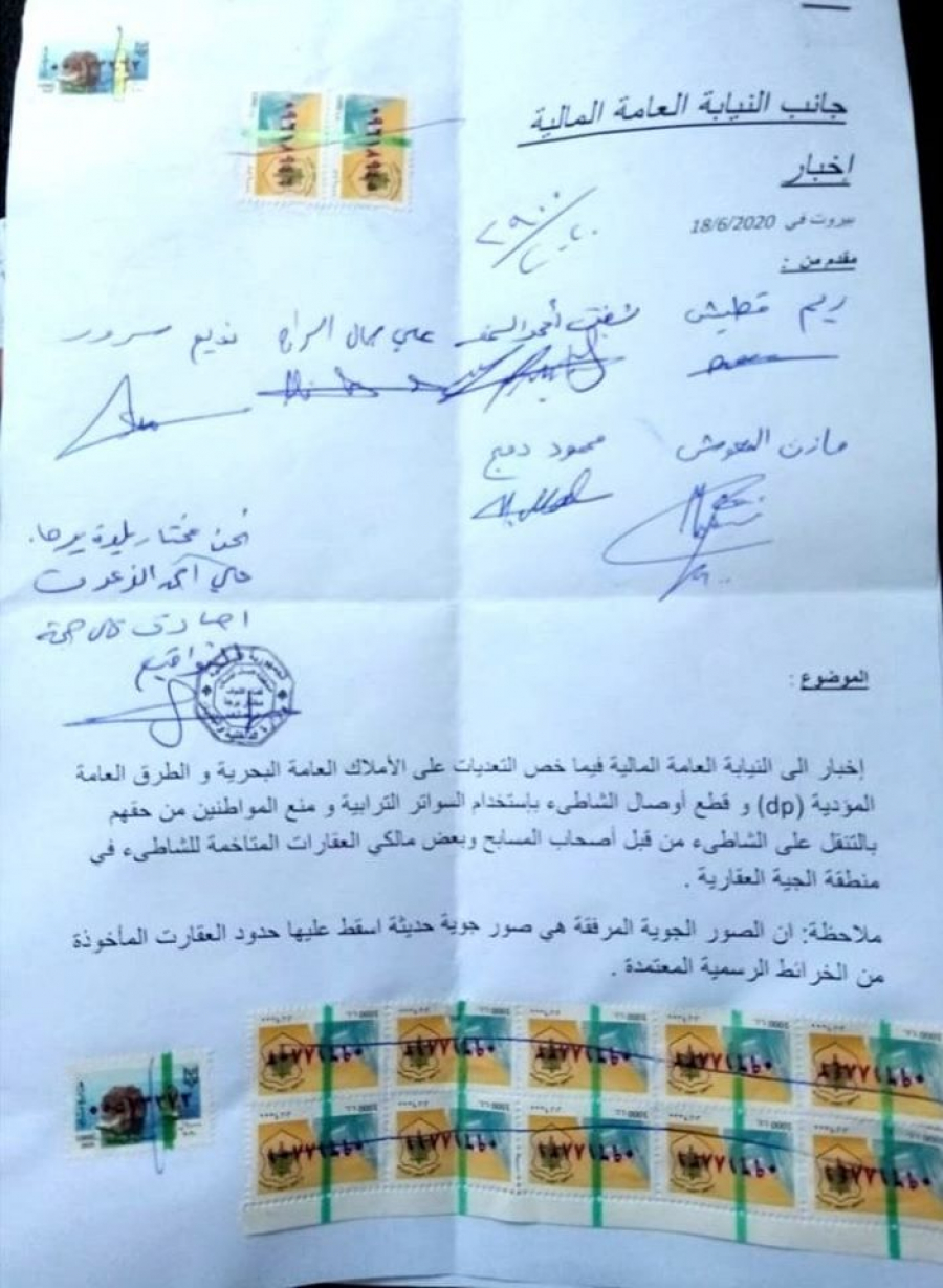 من أجل حق وصول المواطنين إلى الشاطئ العام، وعملاً بالقانون رقم ٦٤/٢٠١٧ الذي يمنع إغلاق المنافذ إليه، تقدم الحراك الوطني_برجا بإخبار إلى النيابة العامة المالية، وعليه تم الإستحصال على قرار موجه الى الجهات المختصة يطلب بواسطته معالجة المخالفات تجاه القانون المذكور. وعليه تم تسجيل القرار في فصيلة الدامور بتاريخه.