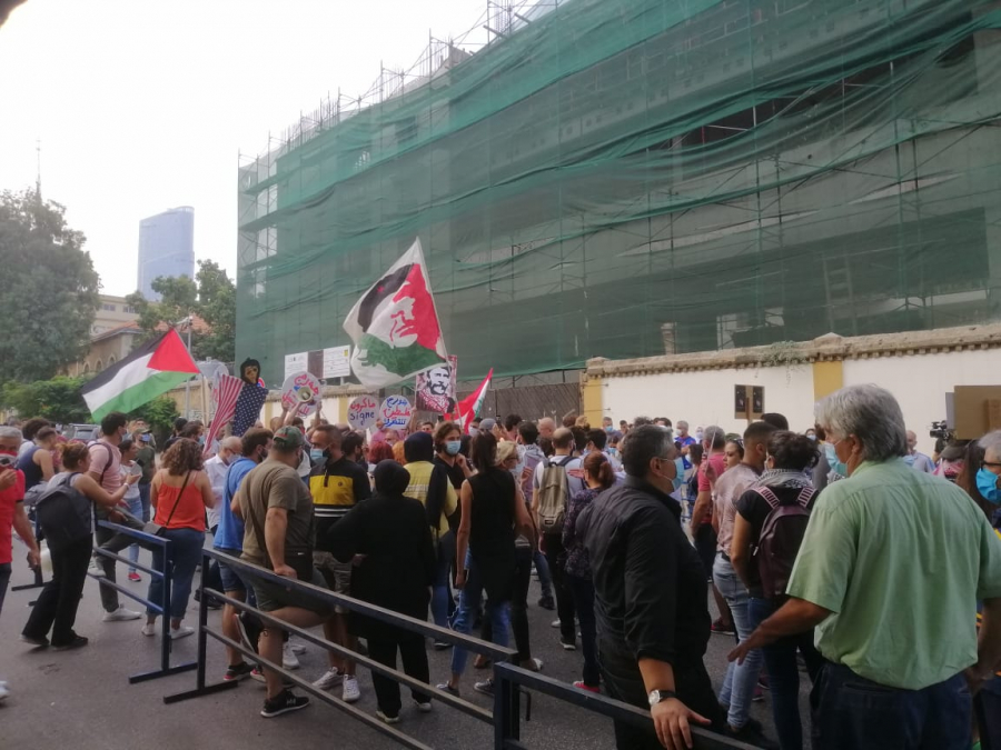 وحصل تلاسن وتدافع بين المتظاهرين والقوى الأمنية بسبب محاولاتهم تجاوز العوائق الحديدية والاقتراب من مدخل السفارة.