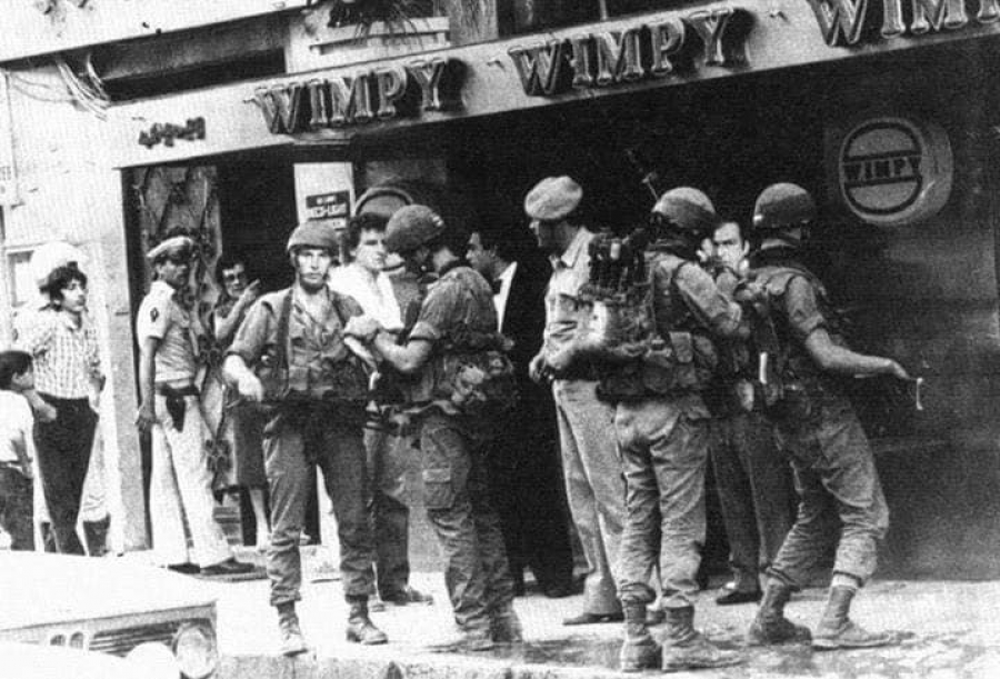 في مقهى "الويمبي" وسط شارع الحمرا، جلس ضابط وجنديان إسرائيليان على إحدى الطاولات، الموضوعة خارج المقهى، على زاوية تقاطع شارعي الحمرا وعبد العزيز، وكان بالقرب منهما جيب عسكري...