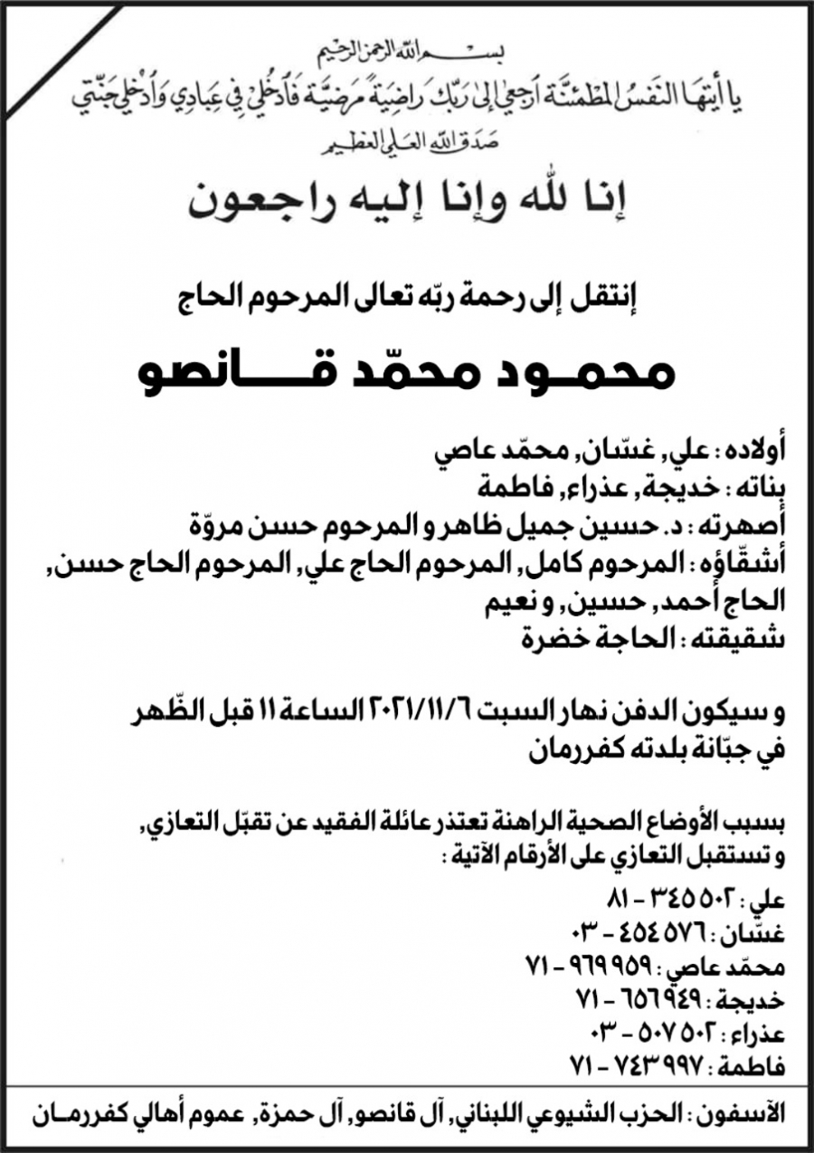 بسبب الأوضاع الصحية الراهنة تعتذر عائلة الفقيد عن تقبل التعازي، وتستقبل التعازي عبر الهاتف