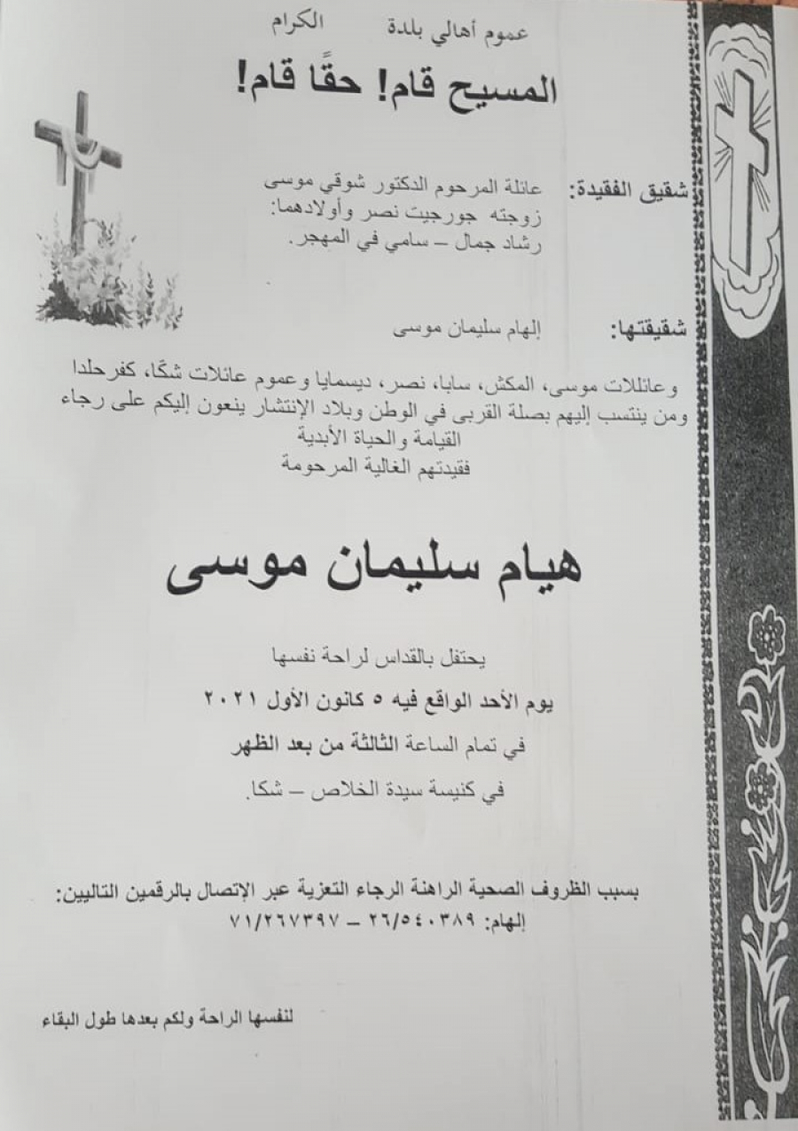 وقد حدد موعد الدفن نهار الاحد الواقع فيه 5 كانون الأول 2021 في تمام الساعة الثالثة من بعد الظهر في كنيسة سيدة الخلاص - شكا