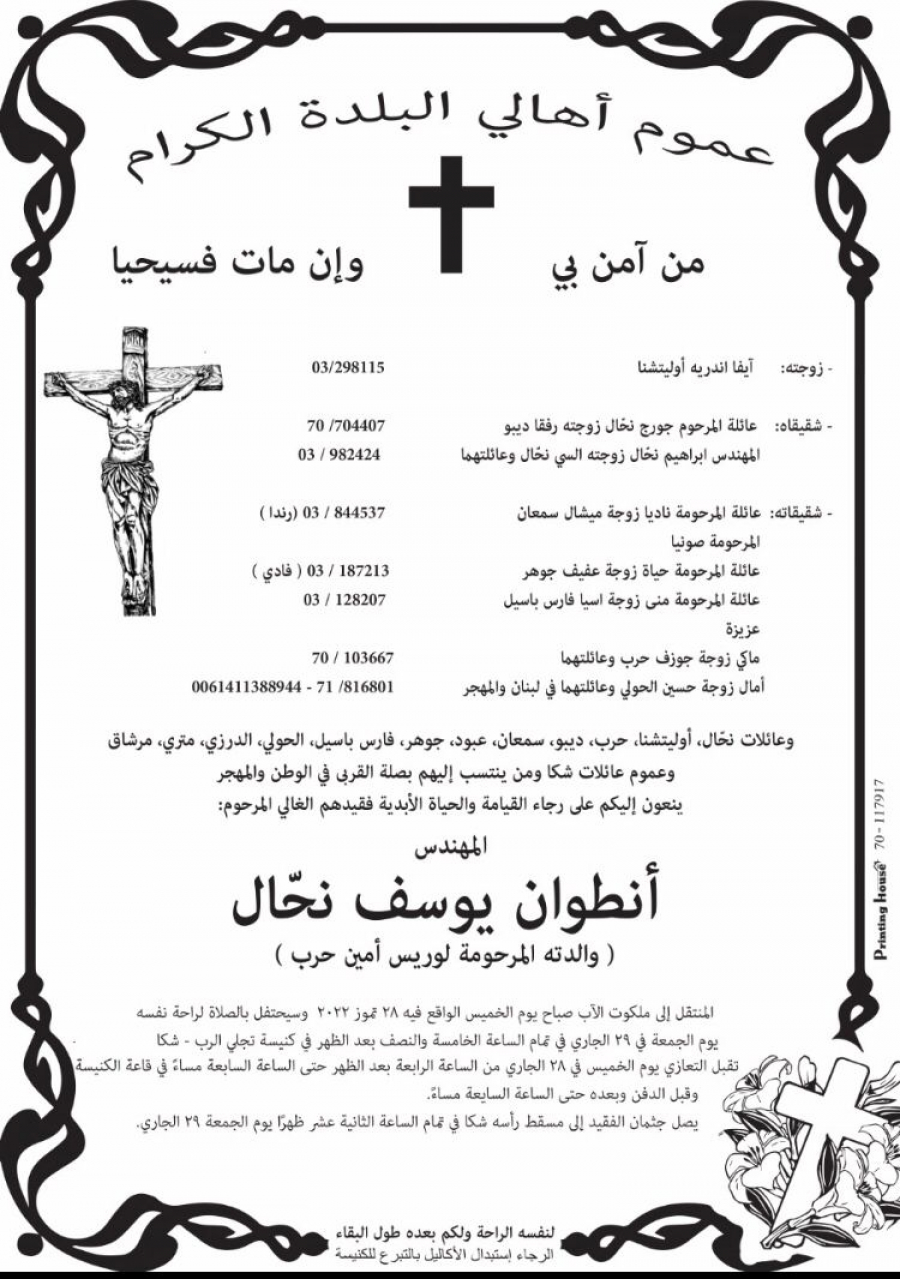 يوارى الثرى في كنيسة تجلي الرب للروم الارتوذكس في شكا الساعة الخامسة والنصف من بعد ظهر يوم الجمعة الواقع فيه ٢٩ ٧ ٢٠٢٢