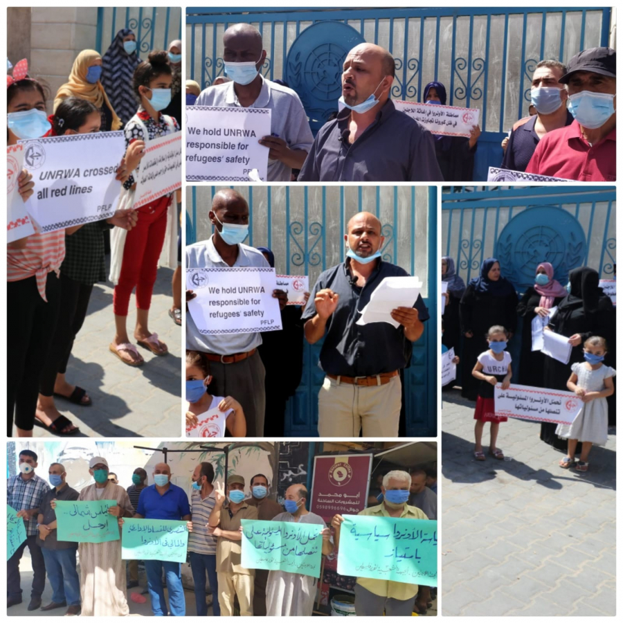 نظمت لجنة اللاجئين التابعة للجبهة الشعبية لتحرير فلسطين في خانيونس وقفتين احتجاجيتين، أمام مقريْ وكالة غوث وتشغيل اللاجئين "الأونروا" في كلٍ من النصيرات ودير البلح، في إطار برنامج الفعاليات الذي أعلنته، احتجاجاً على تنصل الوكالة من مسؤولياتها تجاه شعبنا والمخيمات في قطاع غزة، بالتزامن مع تفشي جائحة كورونا، وتردي الأوضاع المعيشية.