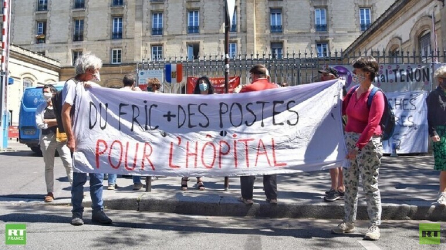 وتجمع الأطباء والمسعفون والممرضات، الذين كاوا يضعون كمامات ويقرعون الأجراس والأواني، أمام مستشفى "روبير دبريه" شمال العاصمة الفرنسية، وقد حمل بعضهم لافتات كتبوا عليها "لا للأوسمة.. لا للقنابل المسيلة للدموع.. نريد أسرة وأموالا".