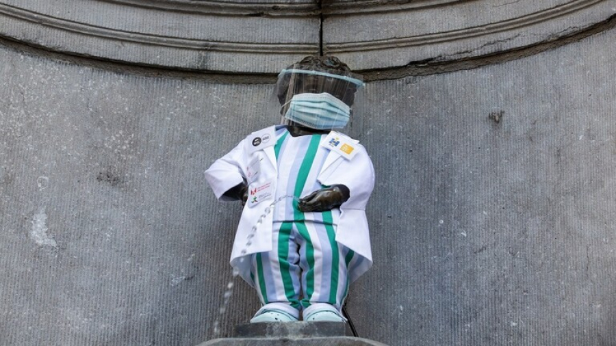 تكريماً للعاملين في القطاعات الصحية.. تمثال شهير وسط بروكسل يتزين بكمامة وثوب أبيض